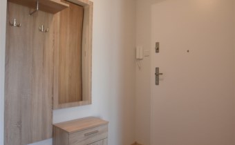 W przedpokoju szafa w zabudowie, wieszak na garderobę z lustrem.